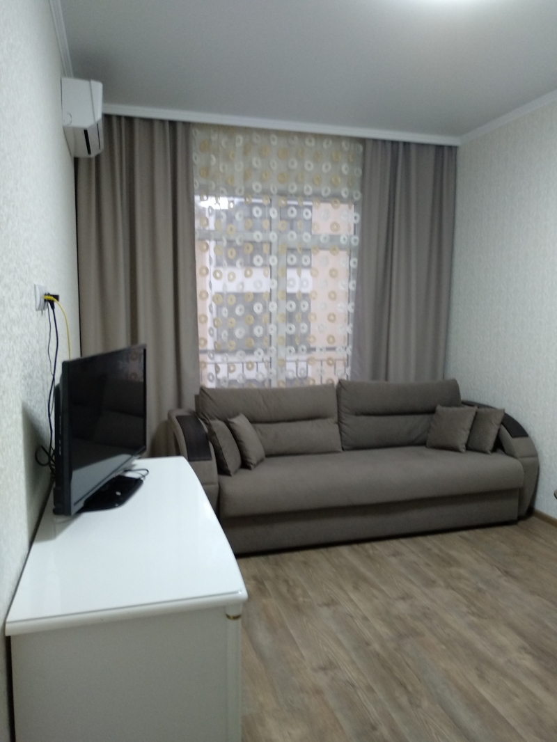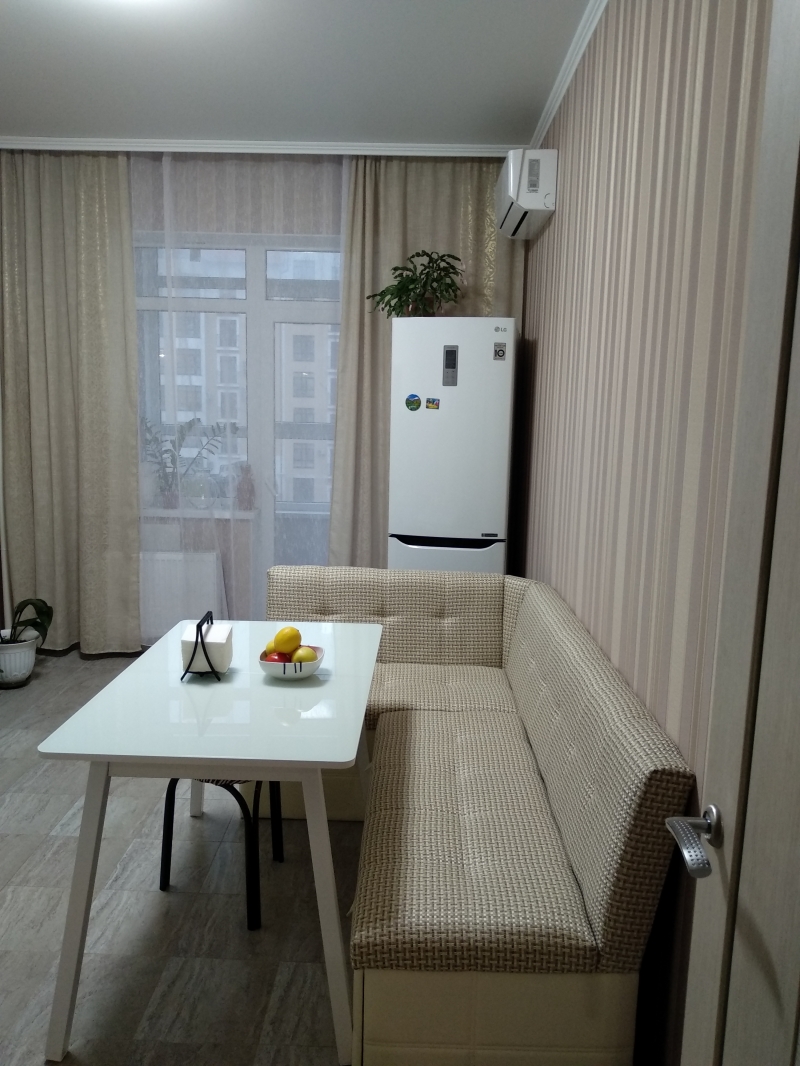 Продается новая 1 к.квартира с ремонтом 41,3 кв.м.+ лоджия 3 кв.м.,в элитном доме с закрытой территорией. Мебель и бытовая техника всё новое. Потолки натяжные матовые. Пол в зале ламинат, на кухне и в коридоре кафель. Лоджия застеклена выход с кухни. В зале декоративный французский балкон. Установлены два кондиционера. Лифт есть. Окна выходят во двор.